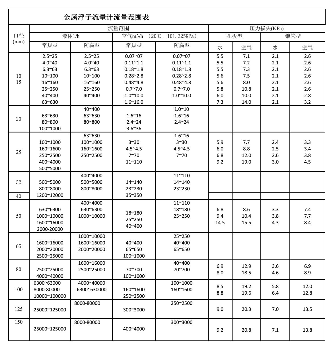 防腐型金屬浮子流量計(jì)性能參數(shù):