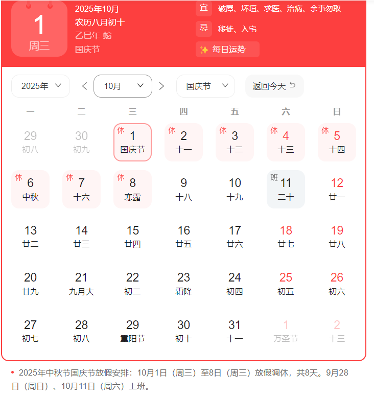 根據國務院辦公廳通知精神,結合公司實際,考慮到公司家人們的家庭情況,經公司研究決定,現將2025年中秋節、國慶節放假安排通知如下:?